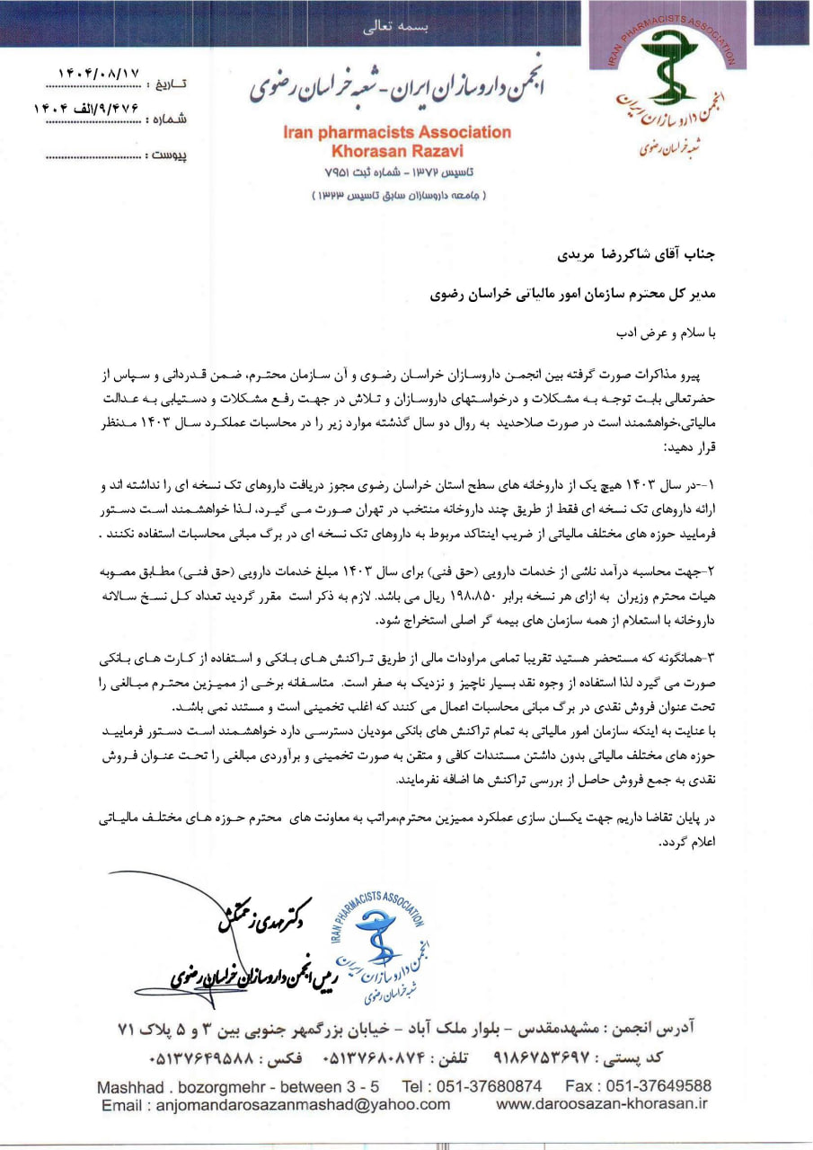 🔹نشستی در دفتر مدیر کل محترم سازمان امور مالیاتی خراسان جناب آقای مریدی با حضور نمایندگان انجمن داروسازان آقای دکتر زحمتکش، آقای دکتر نجفی، آقای دکتر هرویان برگزار گردید.