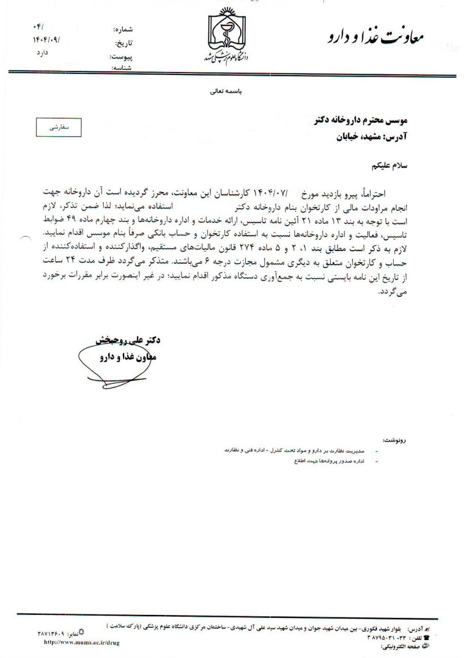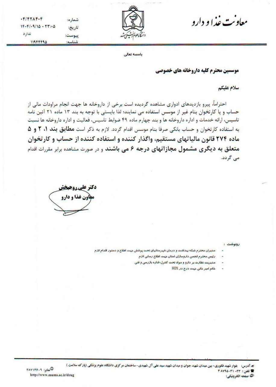 ۱- مقرر گردید عنایت به بند ۱۳ ماده ۲۱ آیین نامه تاسیس و بند ۴ ماده ۴۹ ضوابط، در مراودات مالی داروخانه ها نسبت به استفاده از حسابهای بانکی و یا دستگاههای پوز با نام غیر مؤسس اطلاع رسانی از طریق کانال و گروه تلگرامی انجمن صورت پذیرد تا همکاران نسبت به رعایت آن نهایت دقت و توجه را لحاظ نمایند.
